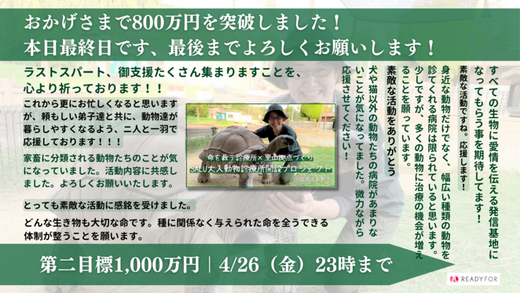 大感謝!!!800万円超えました😿!そしてついにラスト!ご支援は23時までです