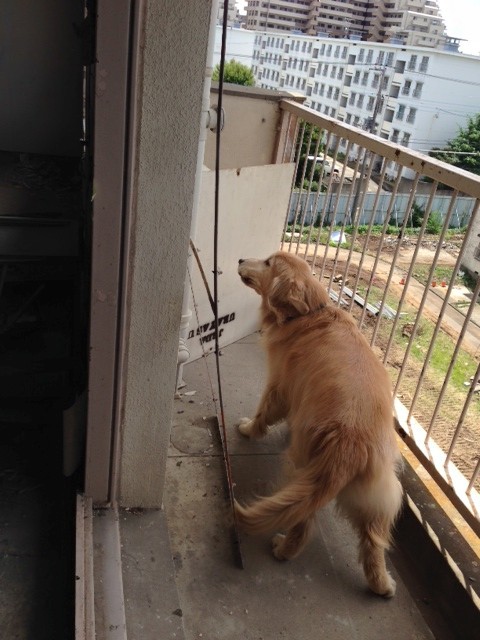 チームのゴールデンレトリバーのナッツ、ベランダに隠れた要救助者役を見つけて吠えて知らせています。