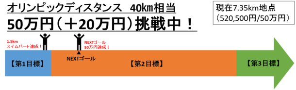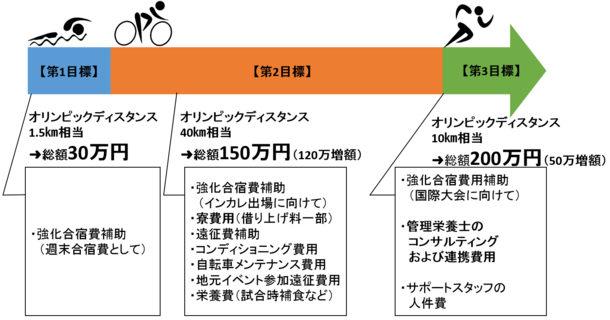 今回のクラウドファンディングでは「オリンピックディスタンス」と題し、トライアスロンになぞらえて3段階で目標金額へ挑戦します!