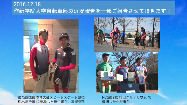 これからも皆様の想いに応え、全国の舞台で活躍していけるよう、全力で取り組んで参りたいと思います。また、この時期に、大変遅くはなりましたが、先週の小池選手の優勝を機に、皆様からの支援金をもとに強化合宿を行わせて頂きたいと思っております。我々にとって先週の小池選手の優勝は大変勇気付けられる思いでした。そこで、強化合宿を図り、ここで慢心することなく、勝って兜の緒を締め、さらなるレベルアップを図っていく所存です。強化合宿は、昨日より2泊3日の日程で実施しております。その内容は、後日改めてご報告申し上げます。引き続き、作新学院大学自転車部に温かい応援の風を吹かせてくださいますようお願い申し上げます。