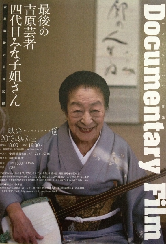 私は、次の2つの柱を立てて活動しております。「老舗文化」とは別に、もう1つ「お座敷文化」をテーマに映像を作成しています。お座敷は、芸者さんのホームグラウンドです。お座敷のことも芸者さんのことも、実は詳しいことあまり知られていません。私は、2005年から「最後の吉原芸者」といわれた「みな子姐さん」を取材し、2013年に映像記録「最後の吉原芸者 四代目みな子姐さん」として完成させ、DVDを発売いたしました。また、READYFORでの御支援者様のお陰様にて、同年6月に第1回上映会を開催させて頂きました。ありがとうございます!これがmakoto officeの最初の活動成果です。