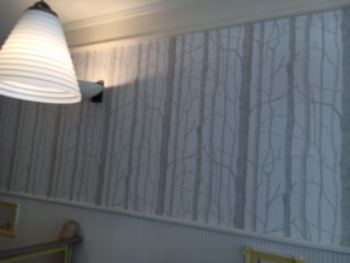 お店がみるみるきれいになっていきます。薄暗かった店内を明るくするために、白っぽいイメージにしてもらいました。壁のクロス、木のデザインで、とても気に入りましたー(*'▽')