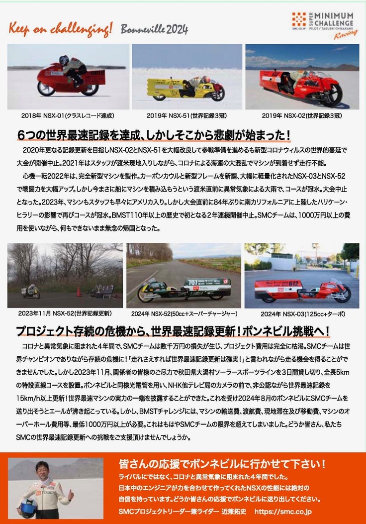 ボンネビルでのSMCチームの参戦中動画を、サポーター様限定視聴でYouTubeにアップします。灼熱の塩の平原で奮戦中のSMCチームを日本から応援頂けます。