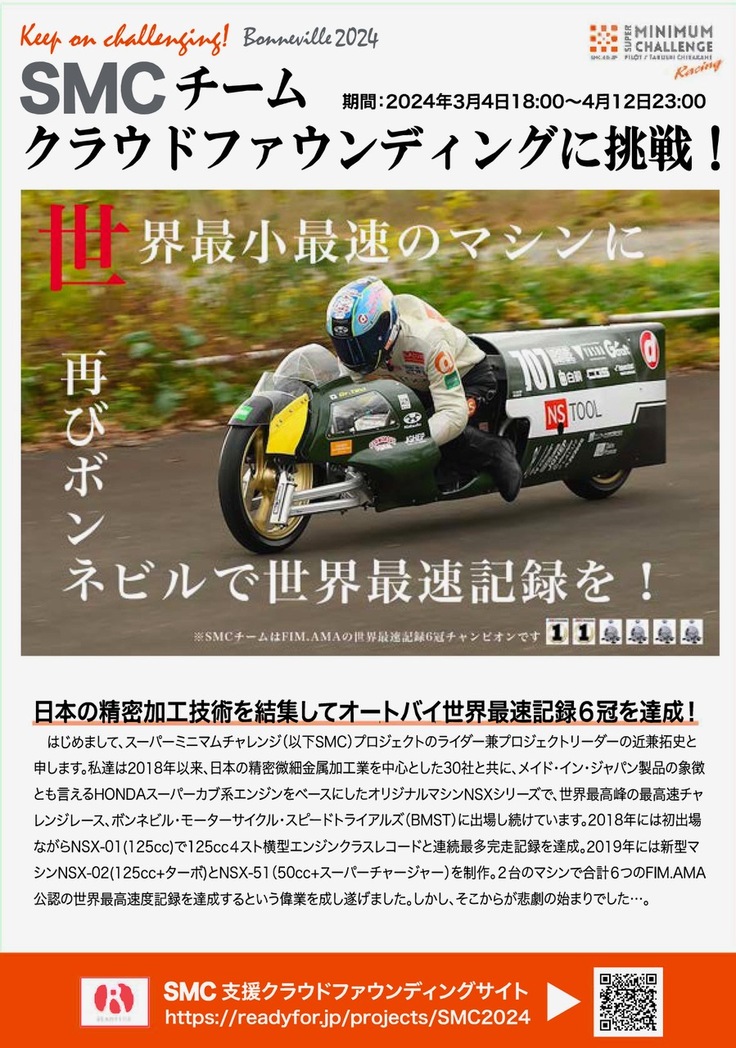 皆でできることを精一杯やってみよう!というわけで、SMCのブースを3月9.10日に鈴鹿サーキットで開催される、鈴鹿2&4に出店することになりました。NSX-52とNSX-03の2台のマシンを展示し、SMCグッズも販売します。そして大阪から応援団も!3月9日㈯に、SMCブースで、ラジオ大阪「近兼拓史のウィークリーワールドニュース」の公開収録を行うことになりました。アシスタントの中村葵ちゃんも駆けつけてくれます。そしてNSX-52のエンジンスタートデモンストレーションを行います。ボンネビルの音を生で聴けるチャンス!そこで葵ちゃんと一緒にクラウド応援のチラシも配ろうという計画です。ぜひ皆さん可能なら鈴鹿まで応援に来てくださいね。