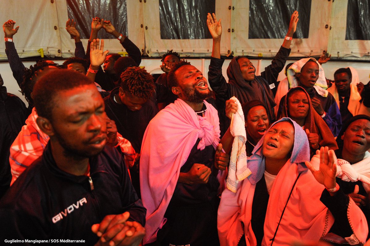 救助された難民一人分の食料や衣類、医療品の値段です。船で働く人全員の手によって搬入しています。