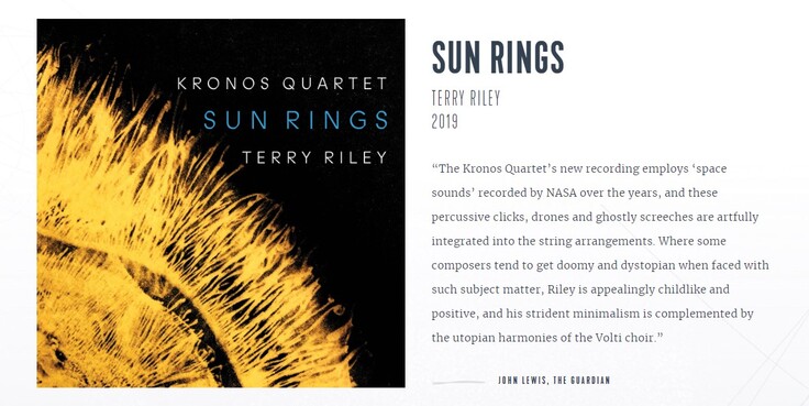 テリー・ライリーとクロノスQとの関係はすでに40年にもわたっており、30もの作品を作曲しています。このテリー・ライリー作曲の『Sun Rings』は、10の「スペーススケープ」からなる作品で、2001年8月に始まり、2002年7月にNASAからの要望で作曲完成したもので、宇宙探査やボイジャー宇宙船によって記録された宇宙の音にインスパイアされたものです。ライヴの「弦」と「合唱」、前もって録音された「スペースサウンド」と融合された音楽です。