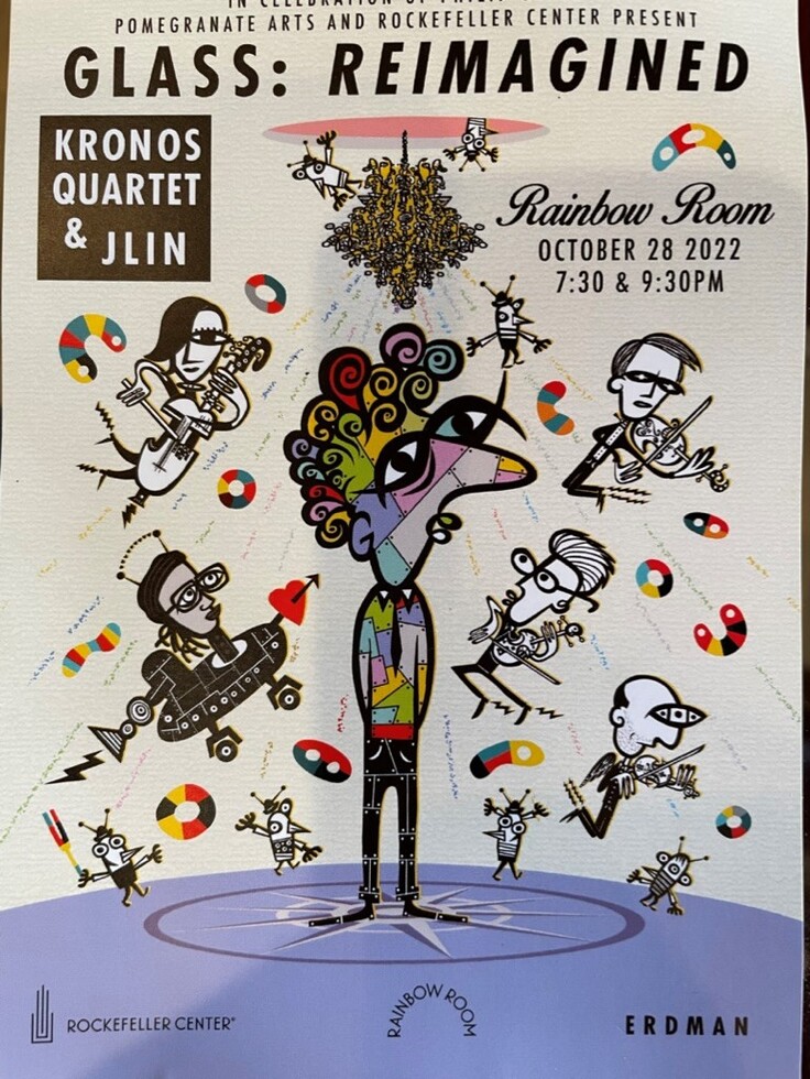 『Glass Reimagined』と名付けられたコンサートでした。フィリップ・グラスはご存知の方も多いと思いますが、交響楽、器楽曲、オペラ、映画音楽と幅広い分野で活躍している現代音楽の巨匠です。グラスは今年80歳。その記念イベントの一つとして企画されたユニークなコンサート。場所は、マンハッタンのど真ん中、ロックフェラーセンターのレインボウ・ルームです。そして、出演者は、クロノス・クァルテットとJlin。Jlinは電子音楽で知られた若手黒人女性。舞台の上には、キーボードとクァルテットのための譜面台、そしてチェロの脇には、足踏みドラムが設定されていました。