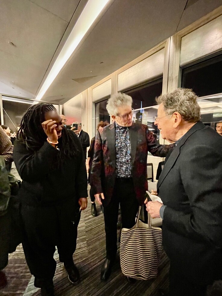 キーボードと弦楽四重奏のジャムセッションは、会場に詰めかけたファンを熱狂させるほどの大成功でした。客席後方で、フィリップ・グラスも楽しんでいました。既成概念の枠を飛び越えて、新鮮な驚きと純粋な音楽の喜びを与えてくれたコンサートでした。アフター・パーティーでは、デイヴィッド・ハリントン(第1バイオリン)とフィリップ・グラスに囲まれて、Jlinが感激して涙を流すという感動的なシーンもありました。