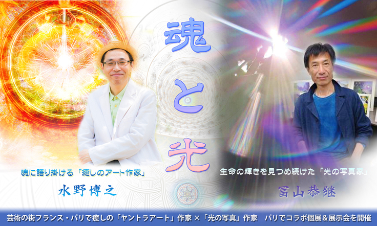 岐阜県岐阜市で「ヤントラスピリチュアルアート」というフラクタルをベースにした、人々の魂に語り掛ける癒しのアートの制作を始めて11年目の水野博之と、三重県大台町在住、自然を五感で感じるままにその生命の輝きとひとつとなり「光の写真」を撮り初めて5年目の冨山恭継です。