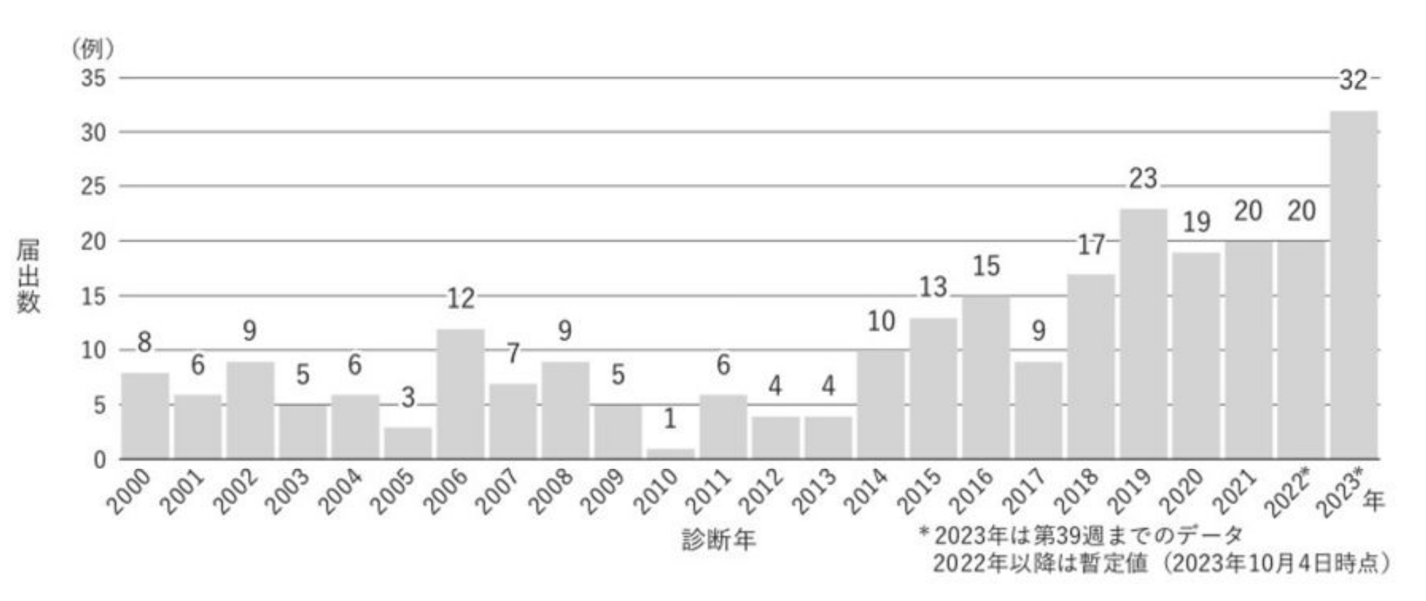 梅毒感染者が増えた結果、感染母体から出生した児、すなわち先天性梅毒の報告者数も過去最多を記録しています。2013年までは先天性梅毒の届出数は年間10例以下であったものの、 2014年から徐々に増え始め、2019年には20例以上が報告されていました。2023年には最終的に37例まで急増しています(図2)。先天性梅毒の胎児では、胎児発育遅延・肝脾腫・心奇形・紫斑・小頭症・水頭症・ 脳内石灰化など数多くの症状伴う問題を有しているのです。
