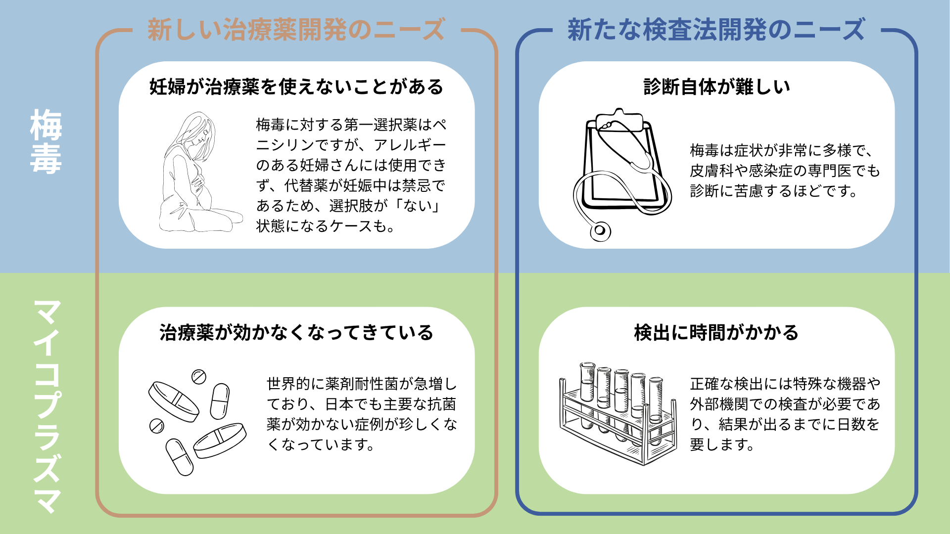 梅毒とマイコプラズマ――それぞれ異なる深刻な課題を抱える性感染症に対して、今こそ「新しい治療薬開発」・「新たな検査法開発」が急務です。
