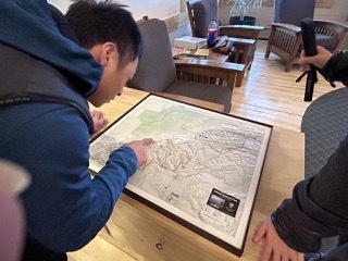 置いてあった立体地図を見ながら、ベースキャンプまでのアプローチルートを確認。