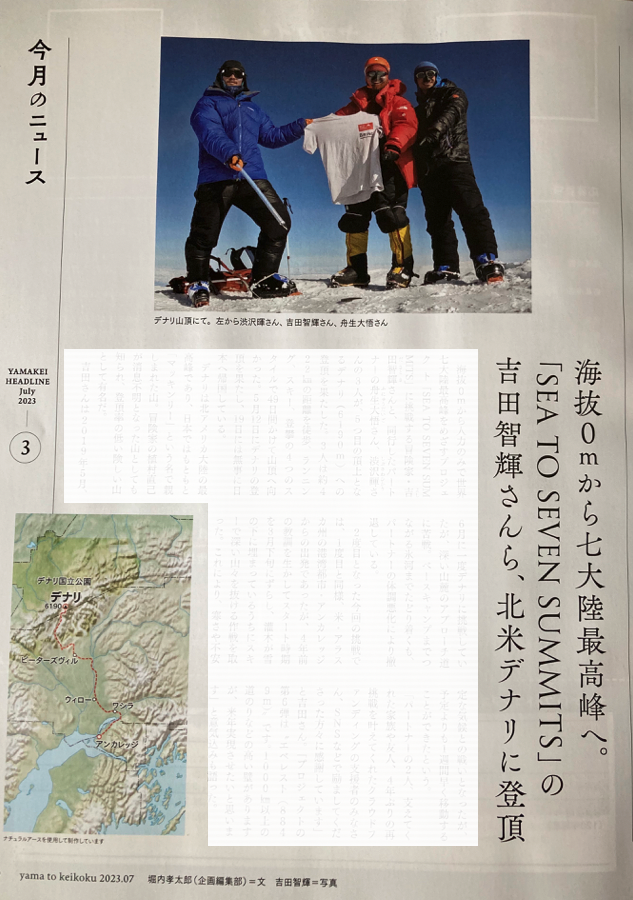 最新の近況報告としては、本遠征が『山と渓谷』7月号のヘッドラインニュースとして取り上げていただきました。素敵な記事にしてくださりありがとうございます!