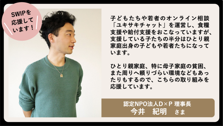 心からその活動を尊敬している、認定NPO法人D×P理事長の今井さんより応援コメントをいただきました。