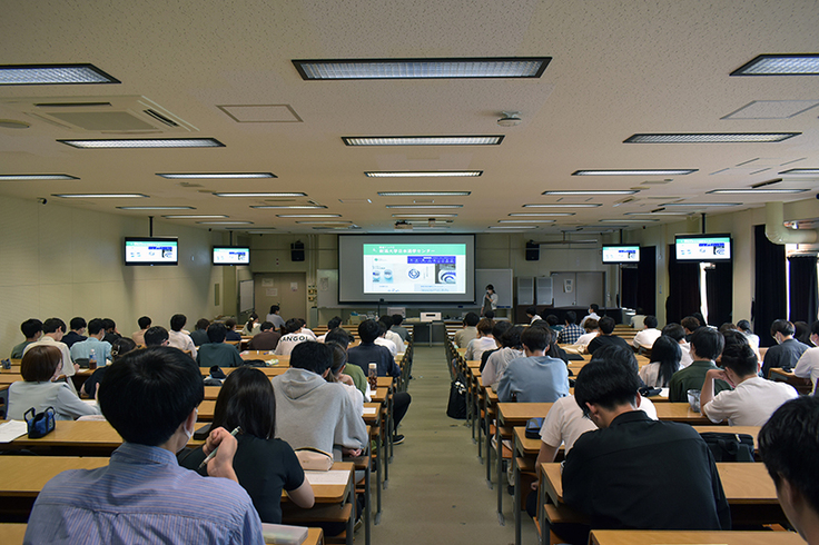 日本酒学C(研究の実践例)は、6月14日(水)から8月2日(水)に開講されました。昨年度に引き続き対面授業となりました。講師は、日本酒学センター所属の特任教員5名で、日本酒に関する多様な分野の最新研究について講義が行われました。最終講義は「日本酒学を考える」と題し、学生からの質問に5人の特任教員が答える形式で日本酒学の学びを深めました。定員100名のところ、250名を超える聴講希望がありました。