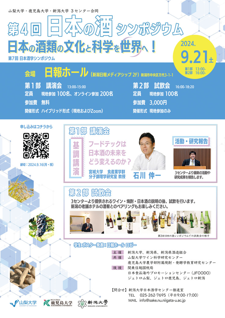 2024年9月21日(土) 13時より、日報ホール(新潟日報メディアシップ 2F)にて、山梨大学ワイン科学研究センター、鹿児島大学農学部附属焼酎・発酵学教育研究センター、新潟大学日本酒学センターの合同による「第4回日本の酒シンポジウム/第7回日本酒学シンポジウム『日本の酒類の文化と科学を世界へ!』」をハイブリッド形式(対面およびオンライン)で開催します。プログラムが公開になりましたので、お知らせいたします。