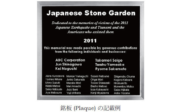 1万円以上のご寄付を頂いた方のお名前は、石庭に飾る「銘板」に(英語で)刻み、寄贈者として後世に伝えたいと思います。文字の大きさと順序は寄付金の額に応じて決め、同じ金額の場合にはABC順とさせて頂きます。