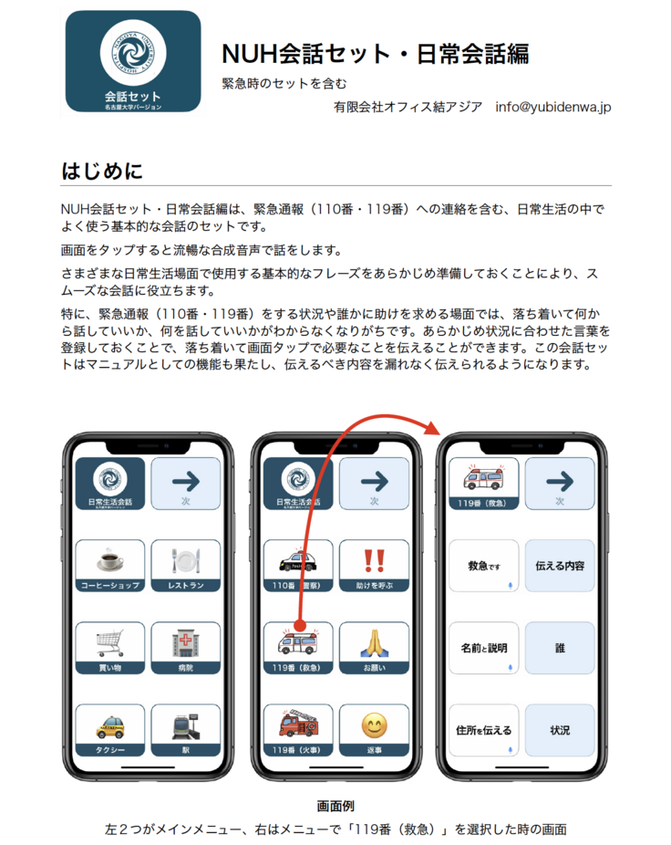 その課題を解決しようと、有限会社オフィス結アジアの高橋さんと共同で研究をしています。具体的には、iPadで使用するコミュニケーションアプリである「指伝話メモリ」に気管切開術をしている患者さん用のモデルを開発しました。有限会社オフィス結アジアと名大病院で、患者さんがより使いやすいように内容を考えて、基本的な会話セットを作成しました。このアプリを使うと、iPadにわかりやすいイラストが出てきますので、そこをタップするだけで、流暢な合成音声が流れて内容を伝えてくれます。気管切開術をしている患者さんは、痰を定期的に吸引することが必要ですが、なかなか自分で訴えることも大変です。このモデルを利用すると、iPadですぐに患者さんの訴えを伝えることができるので、正確に迅速な対応をすることができます。名大病院の患者さんにおいても使用して、好評をいただいております。これらの支援アプリをもっと日本全国に普及できるように、引き続き活動を頑張りたいと思います。みなさま、引き続きのご支援、よろしくお願いいたします。