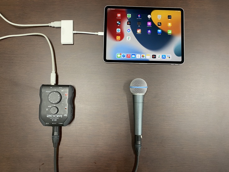 収録では、①iPad、②オーディオインターフェース、③マイク、④これらをつなげるケーブル を主に使用します。