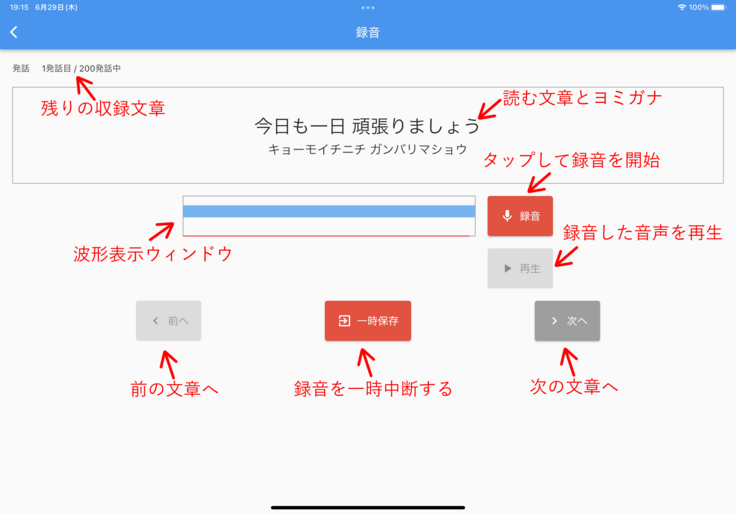 実際の収録画面は画像の通りで、収録者は画面の表示に従って決まった発話内容を数百文読み上げます。