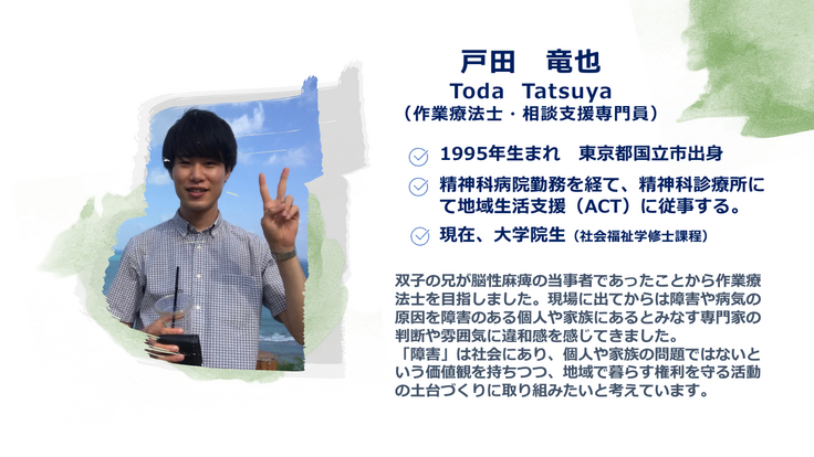 作業療法士の戸田竜也、小林乃愛、清水麻里奈と申します。私たちは精神科診療所、精神科病院、訪問看護ステーションにそれぞれ勤務しております。私たちは元々同じ職場の同僚でした。