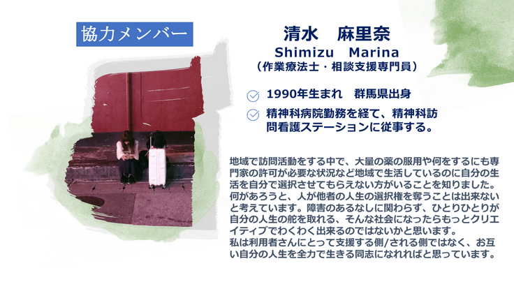 さらに言えば私たちはリハビリテーション職として、精神障がいのある人々の地域生活を守るという使命を果たせていない状況だと認識しています。そこで、専門性を生かしつつ、前述した使命を果たすべく、本プロジェクトを立ち上げました。