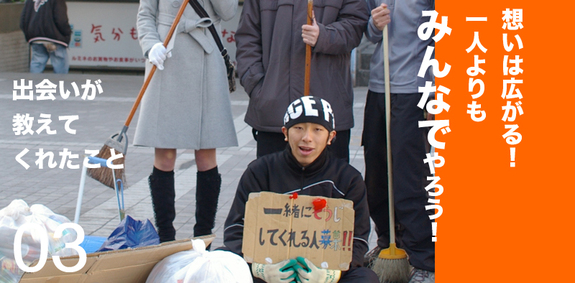 大学時代に「自分を変えたい!」という思いで、毎朝6時から日本一汚い場所新宿駅東口の掃除をたった1人で始める。『背中に一緒に掃除してくれる人募集!』と書かれた看板を背負って始まった活動は、周りの人の心を動かし、ホームレスから始まり、1人、また1人と仲間が増え続けた。半年後の2007年5月3日(護美の日)には、全国で一斉にゴミ拾いを開催。