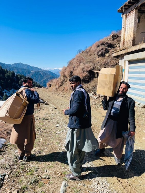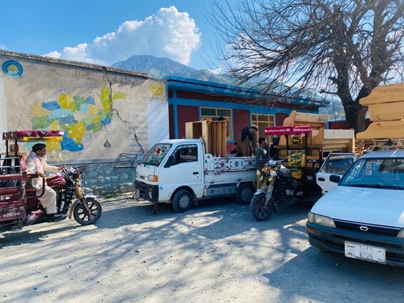 コミュニティベースの教室の多くは、学校に通えていない多くの子どもたちが住む僻地に設置されています。そのため、大型トラックなど車両が通行できないような地域も多々あります。時にはロバを使ったり、人力で運んだり、途中からバイクや小さな車に変更したりして運搬されます。そんな時に、地元に住み慣れた人たちの知恵が重宝されます。