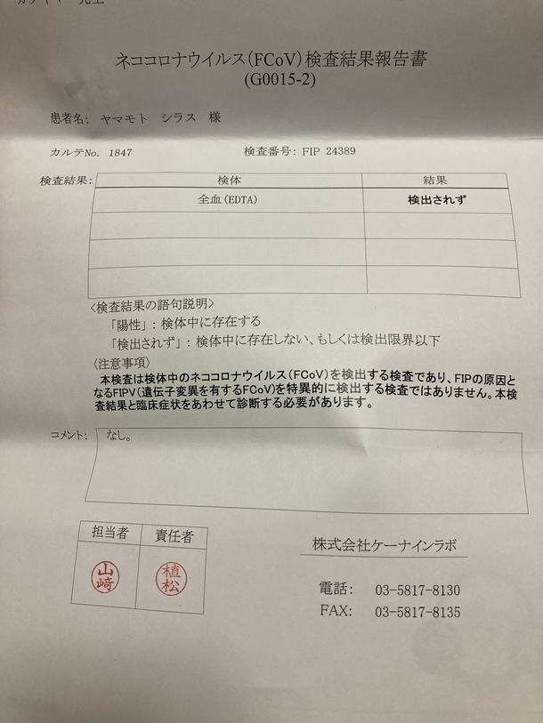 ネココロナウイルスは検出されず、炎症マーカーも基準値内、経過良好です。