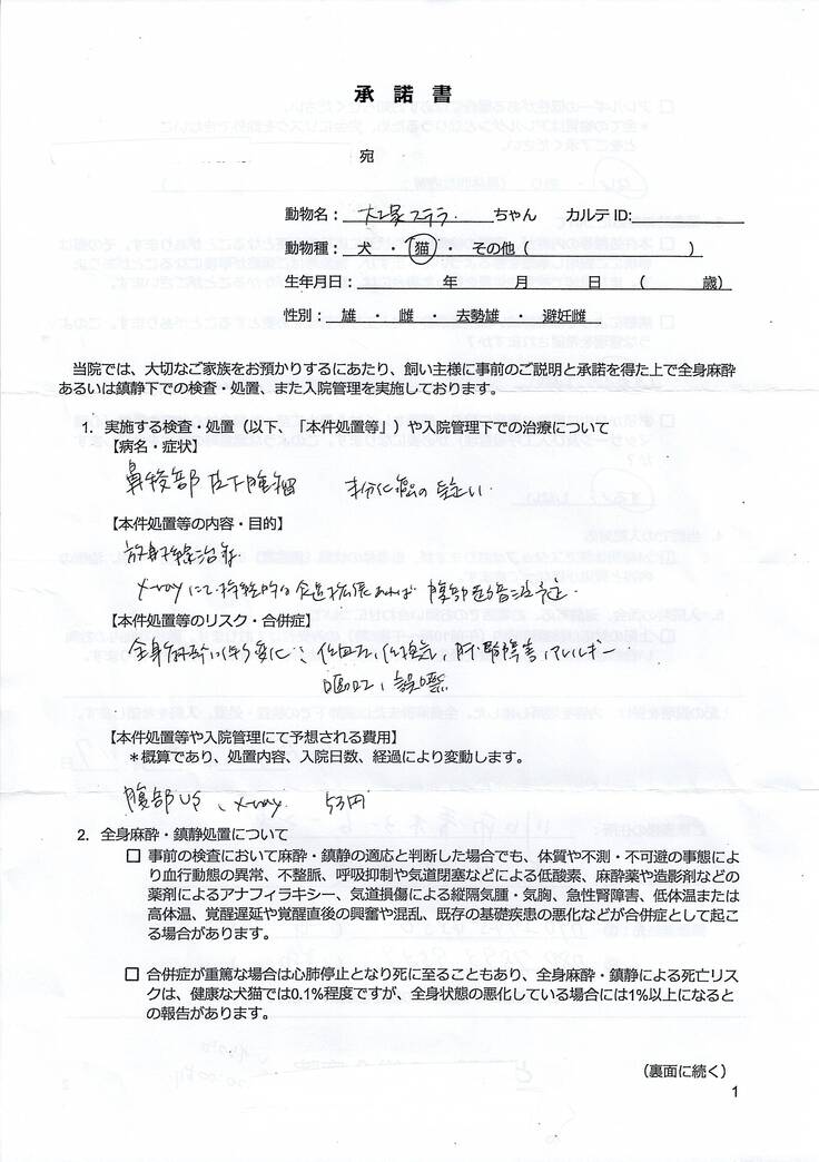 検査の度に絶食をして、麻酔をかけて検査をする中で、ステラは目を覚まし、吐き戻しを何度も今までしているので、消化を促す薬を飲んでいますが、そうなってしまうと誤嚥性肺炎のリスクが大きいということや、また鼻の部分に放射線を当てるので、皮膚炎や、口内炎、そして、手術後で皮膚が薄くなっているところの破裂の可能性などを説明され、また延命措置などの話もされ、承諾書や同意書などに署名をしていたらとても不安になりました。