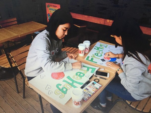 一緒に笑いながらフリーハグのボードを作り、いよいよ!!Busanで日韓友好フリーハグ開始!!