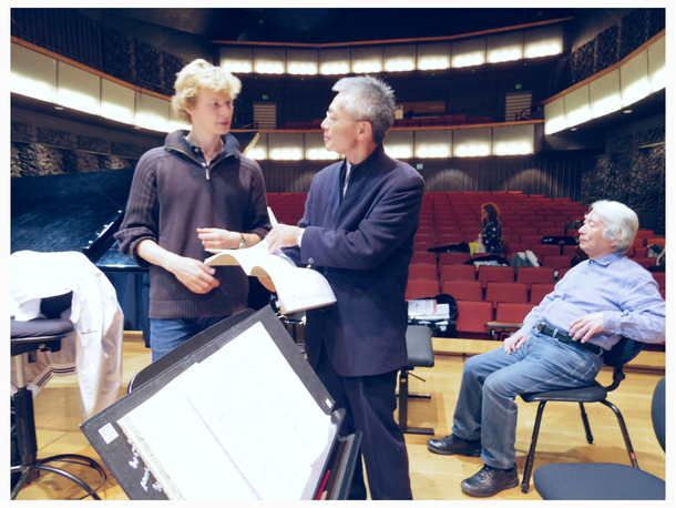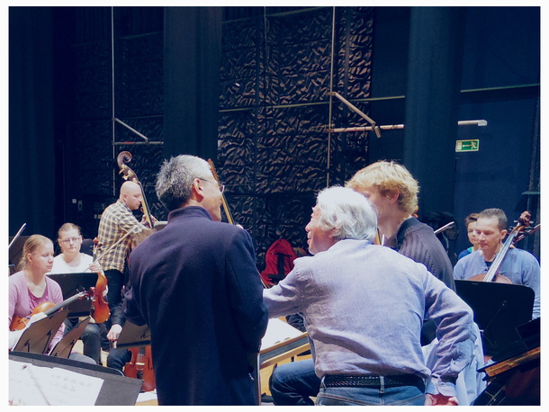 この話は指揮を依頼してから随分後で知ったのですが、指揮者のEeroさんは元々ピアニスト志望でした。しかしスキーで右腕を痛めプロのピアニストへの道はあきらめたそうです。副科でやっていたクラリネットに方向を替え、そして今は指揮者としても活躍されています。ピアノが弾けなくなる衝撃を経験した彼にお願いしたことも何か不思議な”ご縁”を感じます。今回の管楽器メンバーはEeroさんの仲間たちで若くて優秀な人が集ってくれました!今日は光永さんに色々とアドバイスをいただきながら良いリハーサルができました。