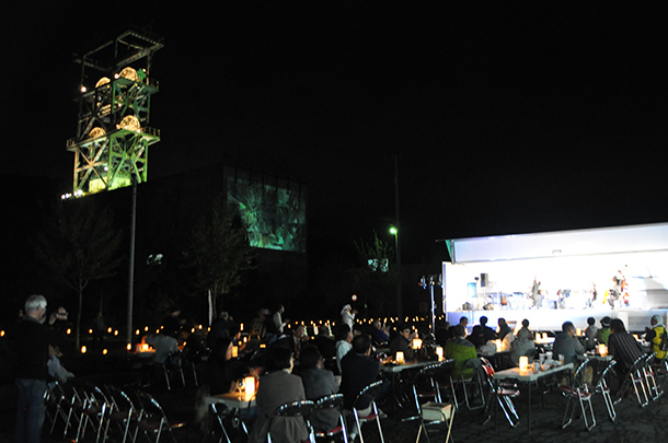 カウントダウンと共に立坑やぐらがライトアップされると、会場からは大きな拍手をいただきました。壁面に映し出される映像やアート作品とコンサートによって、会場は心地よい緩やかな空気感に包まれていたように感じます。こうして1日目は大きなトラブルもなく盛況の中幕を閉じました。
