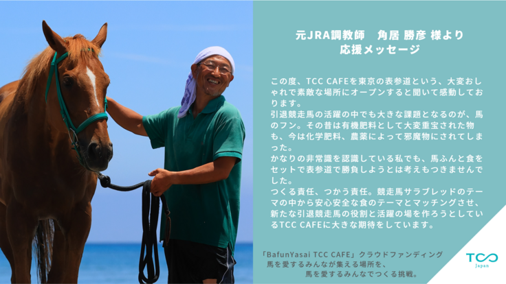 「BAFUN」×「食」という新たな切り口から引退競走馬を支援する「BafunYasai TCC CAFE」の取り組みに、ぜひご支援ご協力をよろしくお願いします。