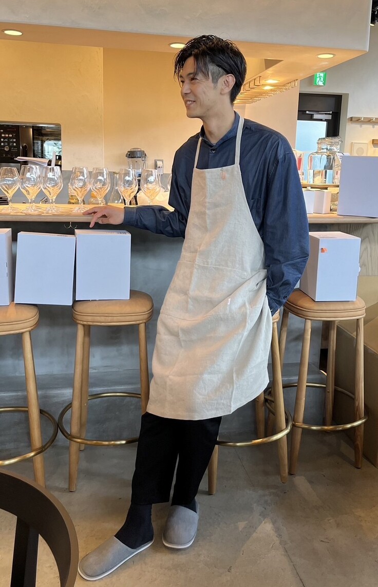 黒のパンツにTシャツまたは襟なしシャツ、そしてその上に風合いが素敵な100%リネンのエプロンを着用します。