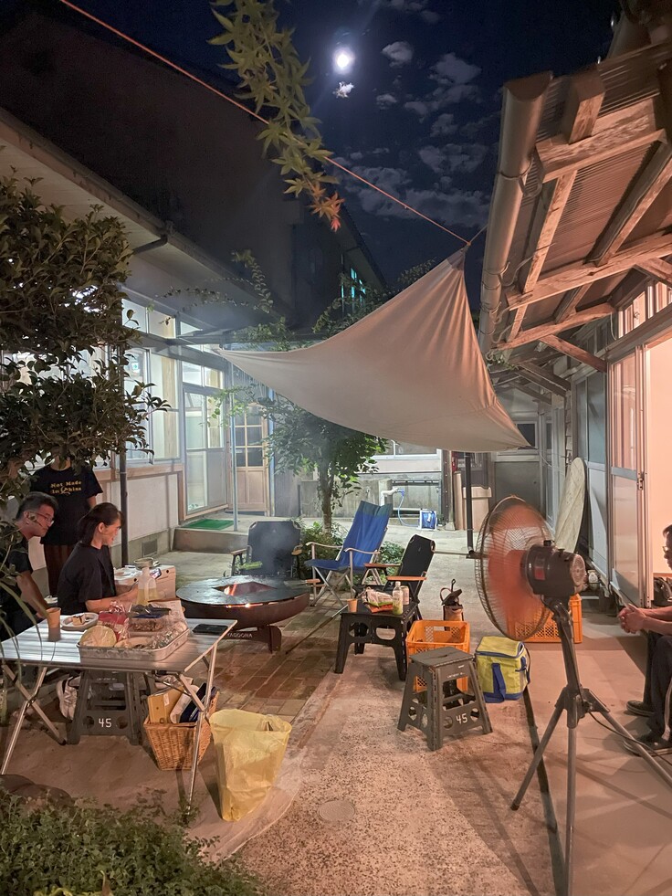 今回は、池のあった場所をレンガ敷きに改装した場所で、焚き火のできるファイヤーボウルを中心に、夏に開催した大谷夏祭りの実行委員会メンバーでBBQ直会を開催