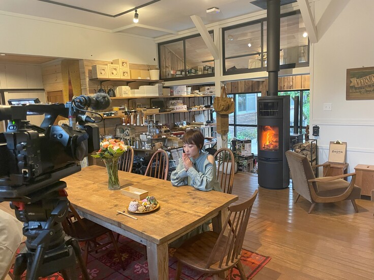 今年一番の冷え込んだ日となり、初めて薪ストーブにも火を入れた cafe 営業終りで、レポーターにフリーアナウンサーの原奈津美さんをお迎えして、様々なシーンの撮影を