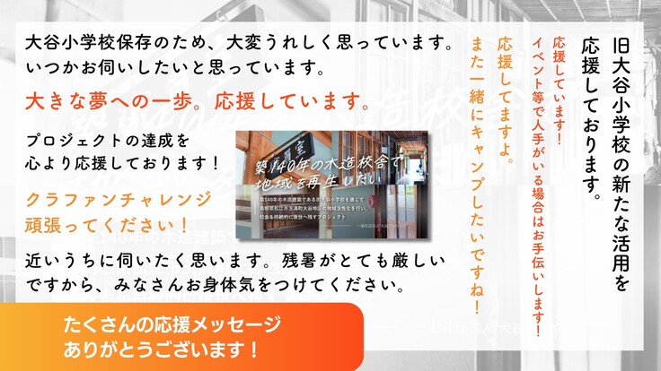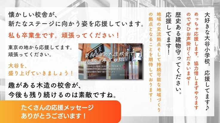 旧大谷小学校を卒業された方、先生・職員として関わられた方、現在もここを何とか活用したいと志を同じくする方、仕事上の御取引先・顧客様の方々、関わりはないがこの活動に共感をいただいた方