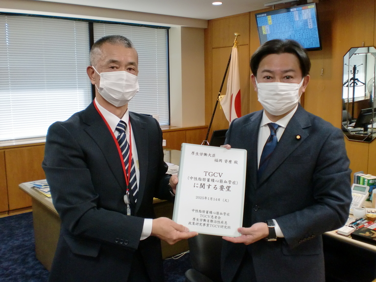 中性脂肪蓄積心筋血管症(TGCV)患者会が、福岡資麿厚生労働大臣に対し、TGCVを早急に指定難病として承認するよう要望書を提出しました。