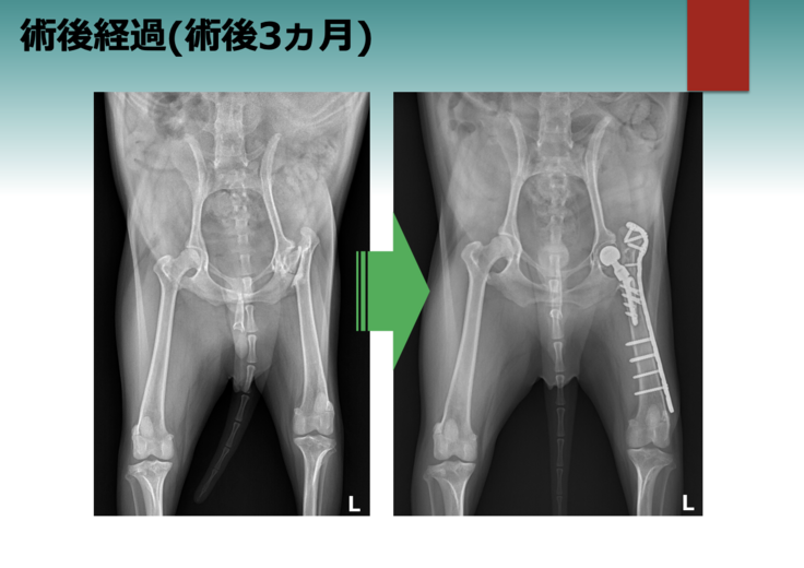 このワンちゃんの場合には通常の股関節全置換術と異なり、大腿骨を一度切ってから繋ぐという工夫が必要でしたが、大変な手術を乗り越えてくれました。この後の犬生を引き続き元気に歩いて過ごしてもらいたいです!