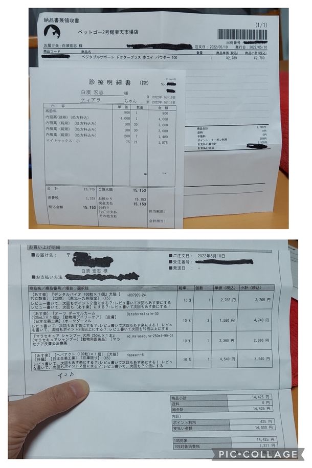 病院で、買うと高いので、ネットで、買ったサプリと、シャンプー、保湿液の領収書と、病院の領収書、一緒に貼っりました。1部重ねてます。この方がみやすかったので、また、水曜行ったあと、報告させて頂きます。