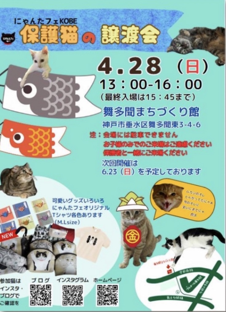 今日、神戸市垂水区で開催された「にゃん太の会」主催の譲渡会にTNR現場で保護された「キジちゃん」「サビちゃん」「ハッチ」が参加させていただきました。