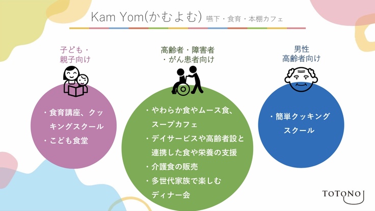 「TOTONOU」には、私たちがこれまで行ってきた事業である美容室、アピアランスサポートセンターが入るほか、全国でもめずらしい嚥下食を提供するカフェに本棚を併設した「Kam Yom」などの施設をオープンします。