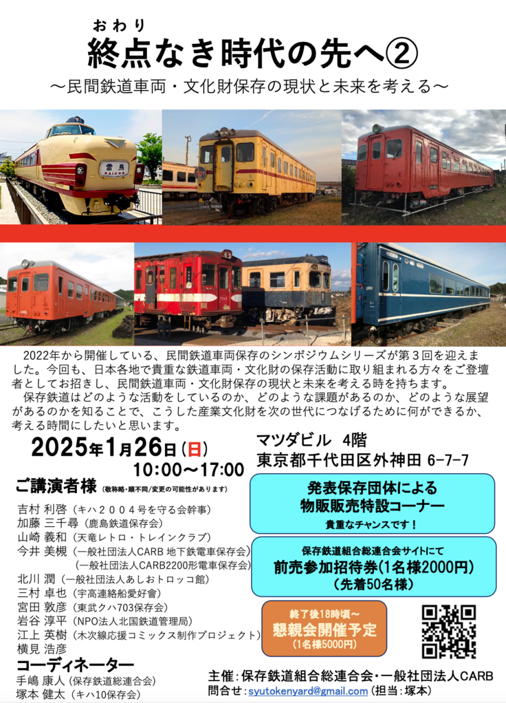 民間鉄道車両・文化財保存の現状と未来を考えるイベント「終点なき時代の先へ②」が開催されます。