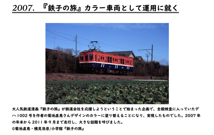というのも、デハ1002号(2040号)は銚子電鉄時代、漫画『鉄子の旅』とタイアップした「鉄子の旅カラー車両」として活躍しました。