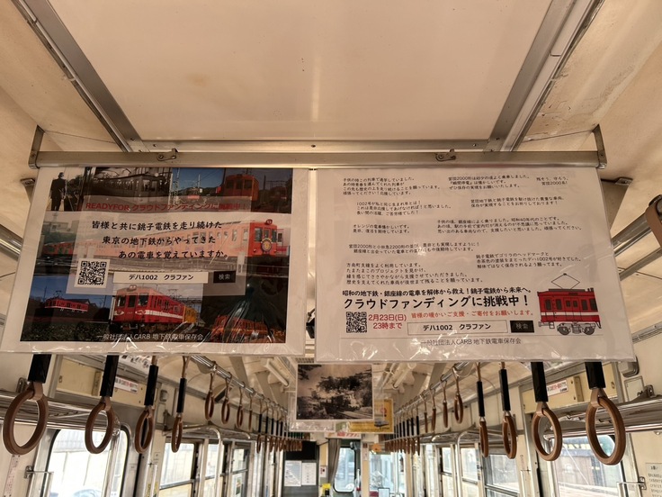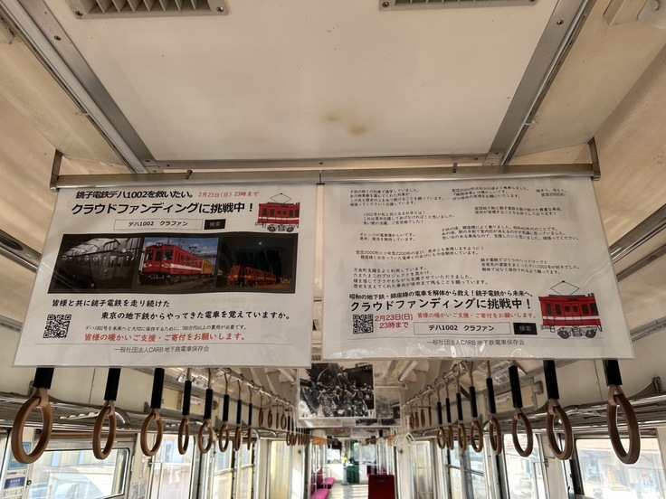 銚子電鉄さんの電車の車内に、デハ1002号(2040号)救出保存プロジェクトの中吊りを本日から掲出させて頂いております。