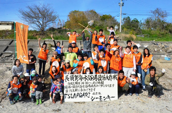 こんにちは!『一般社団法人震災復興支援協会つながり魚竜』 事務局の梅室千里と申します。3.11に被災した南三陸町長須賀の海水浴場を、被災前と同じように地元の海で安心して遊べるようにしたい!と、地元の子供達が海水浴場復活に向けて動き出しました。地元の小学生から高校生約50名でシーモンキーというグループを発足し、2013年3月からビーチクリーンを行っています。そして、遂に!『南三陸 つながりビーチ子ども海広場』として7月20日のオープンが決定致しました!
