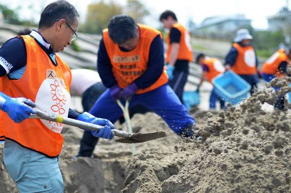 そんな海水浴場を復活させたい!そんな思いで、このプロジェクトは始まりました。3月から始まったビーチクリーンも、地元の子ども達・日本各地からのボランティアにより、述べ1500名以上の方にご参加頂きました。5月には重機も入り、砂浜の掘り起こし作業を行いました。