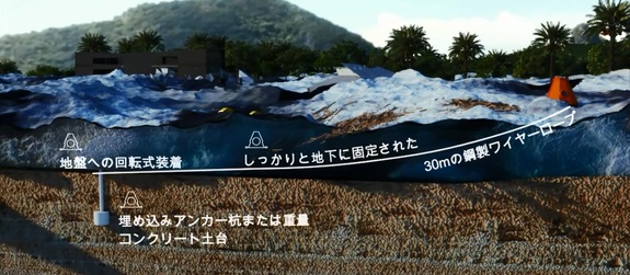 TSUPODは海に流されないようにアンカーで地面でつなぎとめられる仕組みとなっています。