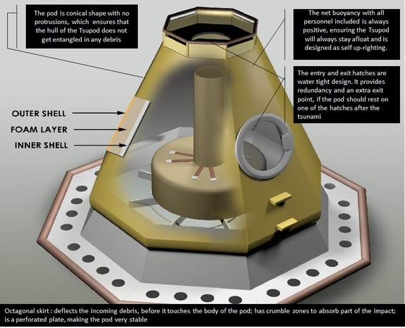 たとえば、ココナッツの実は中のものを完全に保護する機能の良い実例です。ココナッツの実は30メートルもの高さの木から落ちても内部の種子は無傷なままです。また、ココナッツの実は津波に遭っても損傷を受けません。木の実の内部は外殻の繊維によって衝撃を吸収されることで守られているのです。TSUPODの壁面構造はこのココナッツの構造に似せることで、津波に耐えうるデザインになっています。